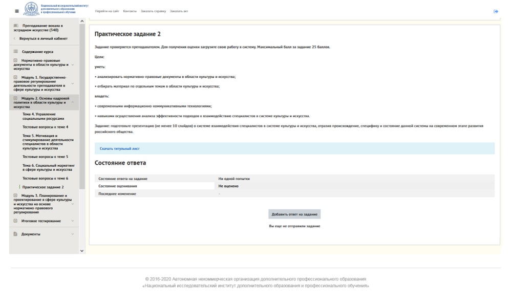 2. Промежуточная аттестация проходит в форме зачета или дифференцированного зачета и включает в себя прохождение тестирования и выполнение практического задания. Тестирование по учебной дисциплине (модулю) позволяет оценить усвоение теоретического материала по пройденной учебной дисциплине (модулю).