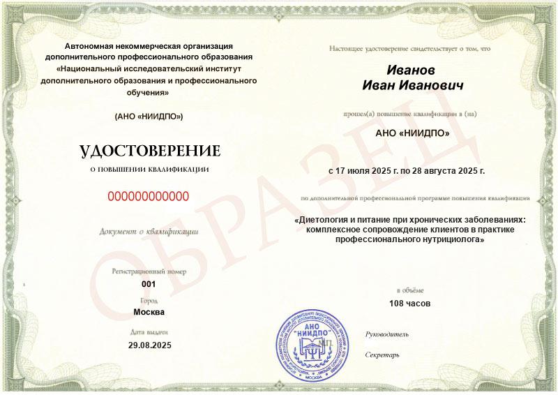 Диетология и питание при хронических заболеваниях: комплексное сопровождение клиентов в практике профессионального нутрициолога (108ч)