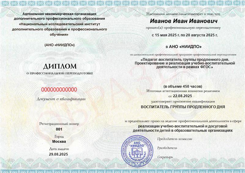 Студент, желающий поступить в АНО «НИИДПО», должен предоставить справку из образовательной организации. Независимо от срока окончания обучения по программе дополнительного образования, диплом о профпереподготовке выдаётся только после предъявления документа о получении среднего профессионального или высшего образования.