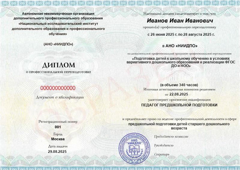 Обзор программы профессиональной переподготовки «Подготовка детей к школьному обучению в условиях вариативного дошкольного образования и реализации ФГОС ДО и НОО» с присвоением квалификации «Педагог предшкольной подготовки»