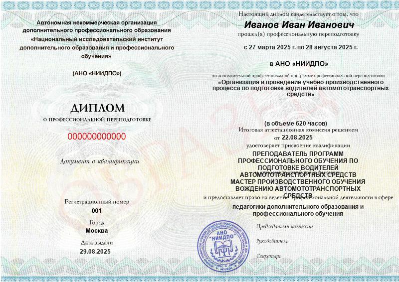• 2 квалификации: Преподаватель программ профессионального обучения по подготовке водителей автомототранспортных средств + Мастер производственного обучения вождению автомототранспортных средств