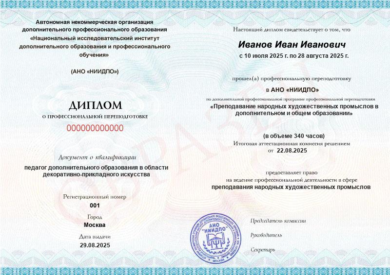 - Квалификация: педагог дополнительного образования в области декоративно-прикладного искусства