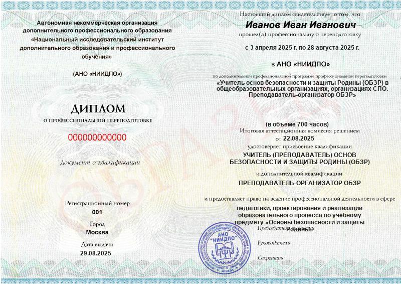 - 2 квалификации: Учитель (преподаватель) основ безопасности и защиты родины (ОБЗР) + Преподаватель-организатор ОБЗР
