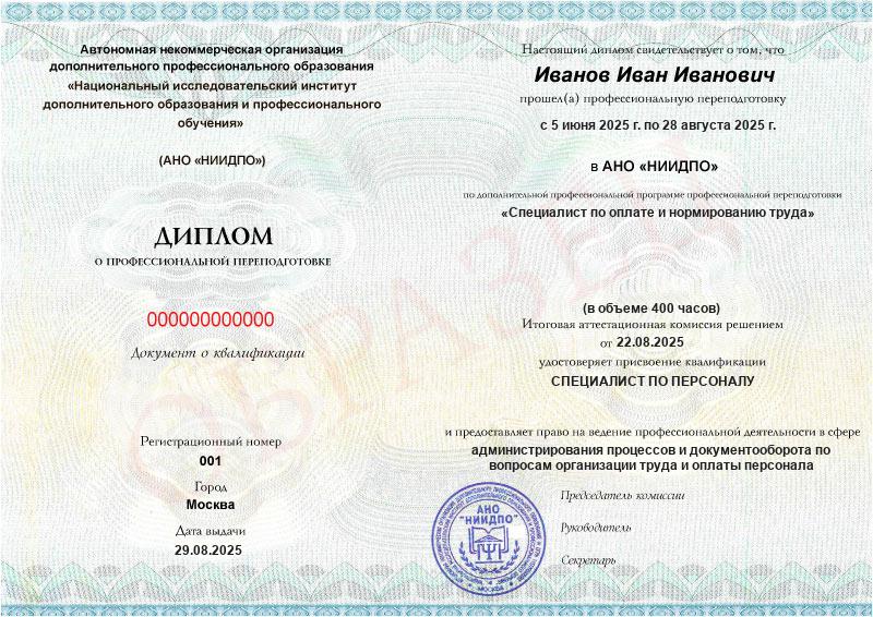 - Диплом о профессиональной переподготовке с присвоением квалификации специалиста по персоналу