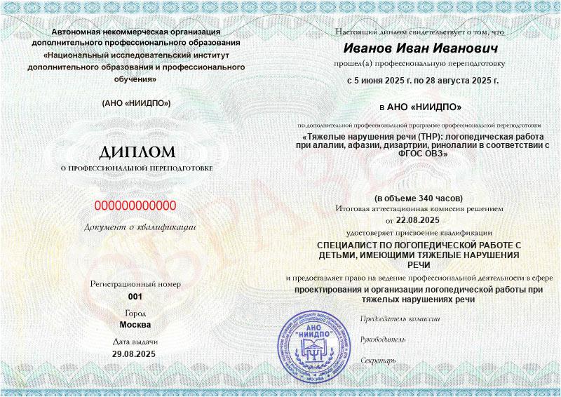 • Квалификация: Специалист по логопедической работе с детьми, имеющими тяжелые нарушения речи