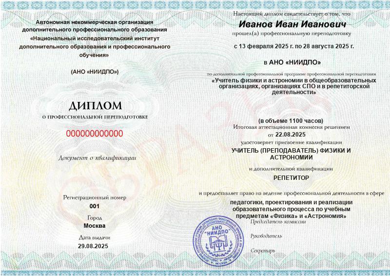- 2 квалификации: Учитель (преподаватель) физики и астрономии + Репетитор