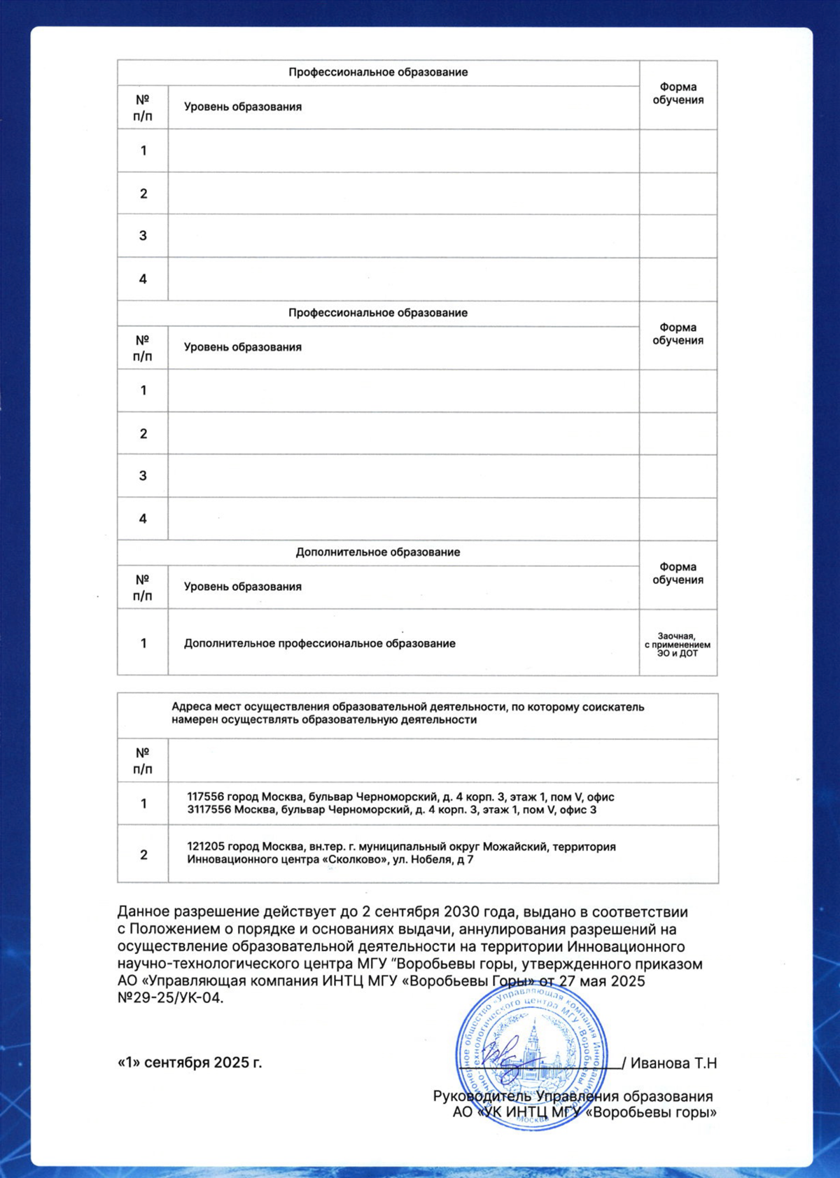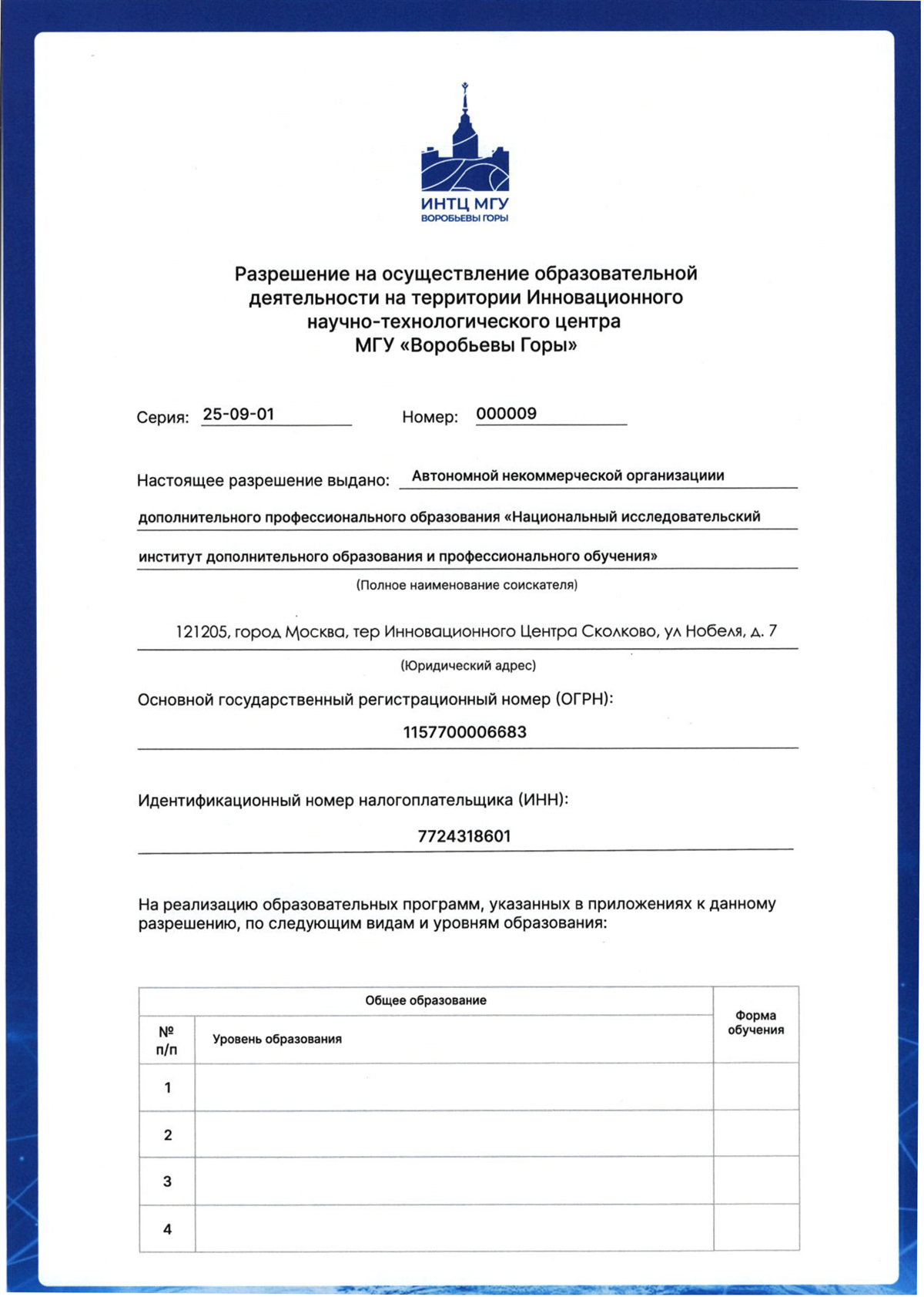 Разрешение на образовательную деятельность от ИНТЦ МГУ Воробьевы горы