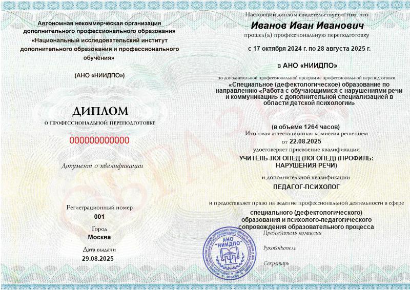 Специальное (дефектологическое) образование по направлению «Работа с обучающимися с нарушениями речи и коммуникации» с дополнительной специализацией в области детской психологии (1264ч)