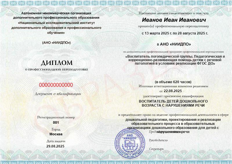 Программа разработана с учетом профстандарта педагога и ФГОС СПО по специальности 44.02.04 «Специальное дошкольное образование». По окончании обучения вы получите диплом, который принимают работодатели и аттестационные комиссии, и сможете официально работать в логогруппах.