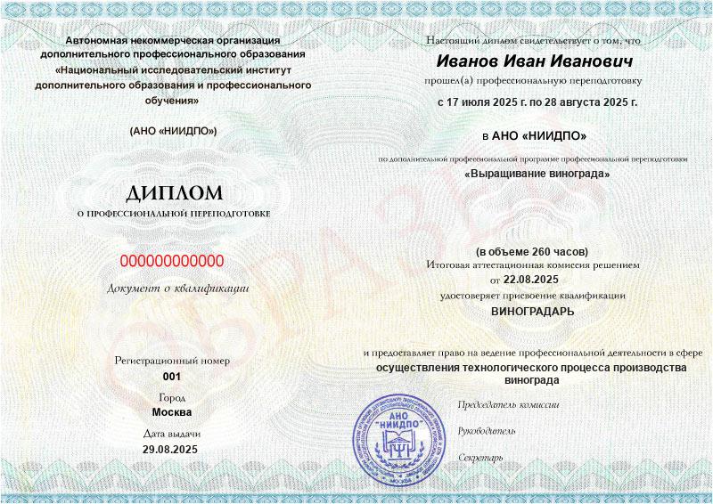 Учебный план программы профессиональной переподготовки «Выращивание винограда» с присвоением квалификации «Виноградарь»